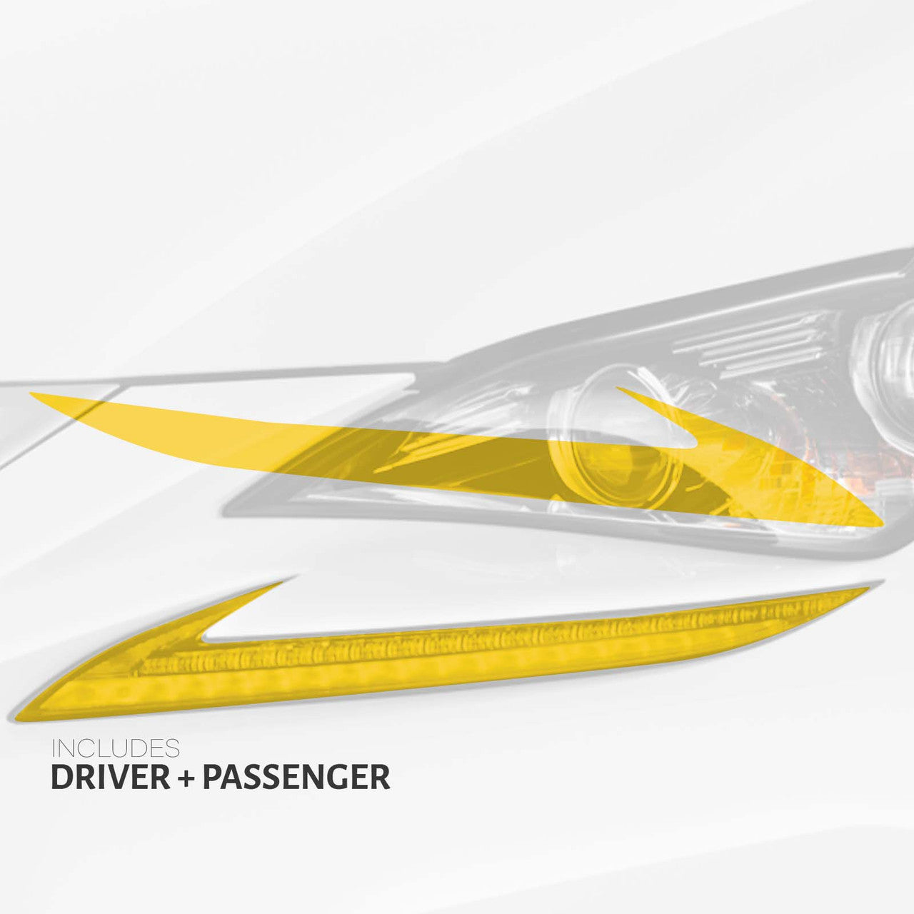 Introducing our Pre-Cut Yellow Headlight DRL vinyl Overlays for the 2015-2019 Lexus RC. These overlays are designed to give your vehicle a unique and stylish look while also providing added protection to your headlight DRL's. Made from high-quality, durable vinyl tint material, these overlays are pre-cut to perfectly fit the shape of your Lexus RC's headlights, making installation a breeze. The vibrant yellow color will not only enhance the appearance of your vehicle but also improve visibility and safety on the road. Whether you're looking to add a pop of color to your car or simply want to protect your headlights from wear and tear, our Pre-Cut Yellow Headlight DRL's Overlays are the perfect solution. Upgrade your Lexus RC's look and functionality with these easy-to-install overlays today! Fits: 200t, RC350, RC300