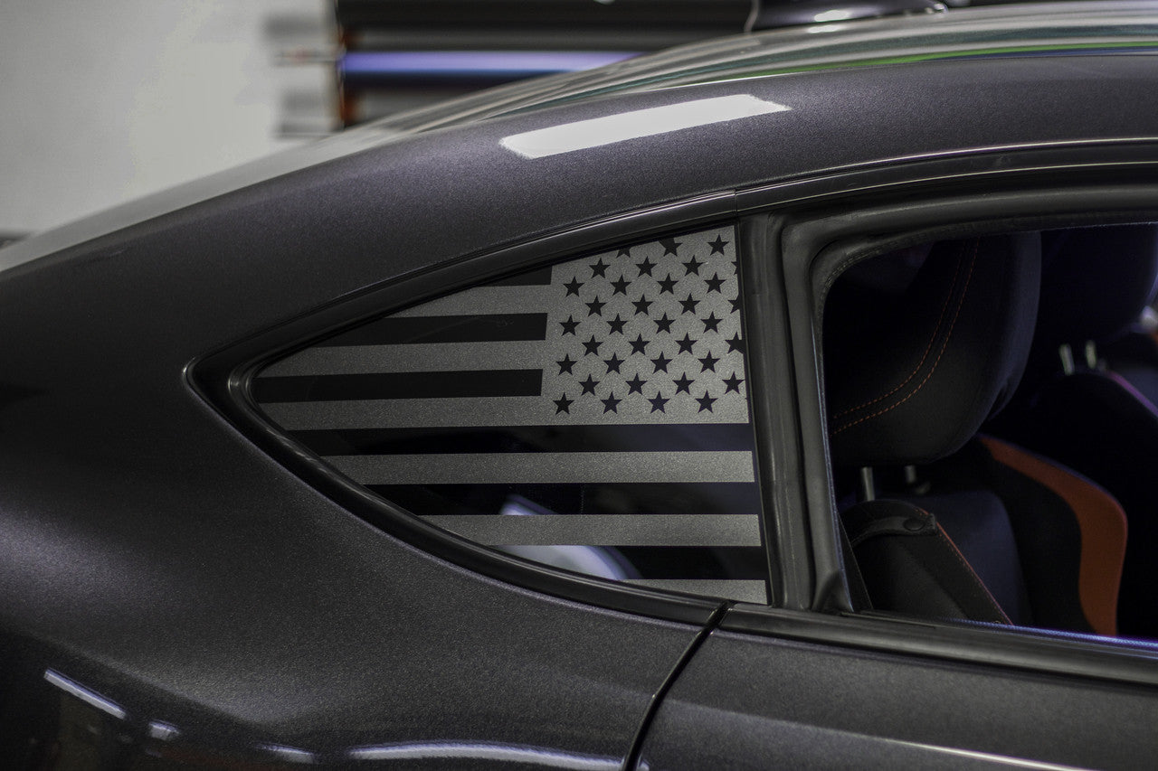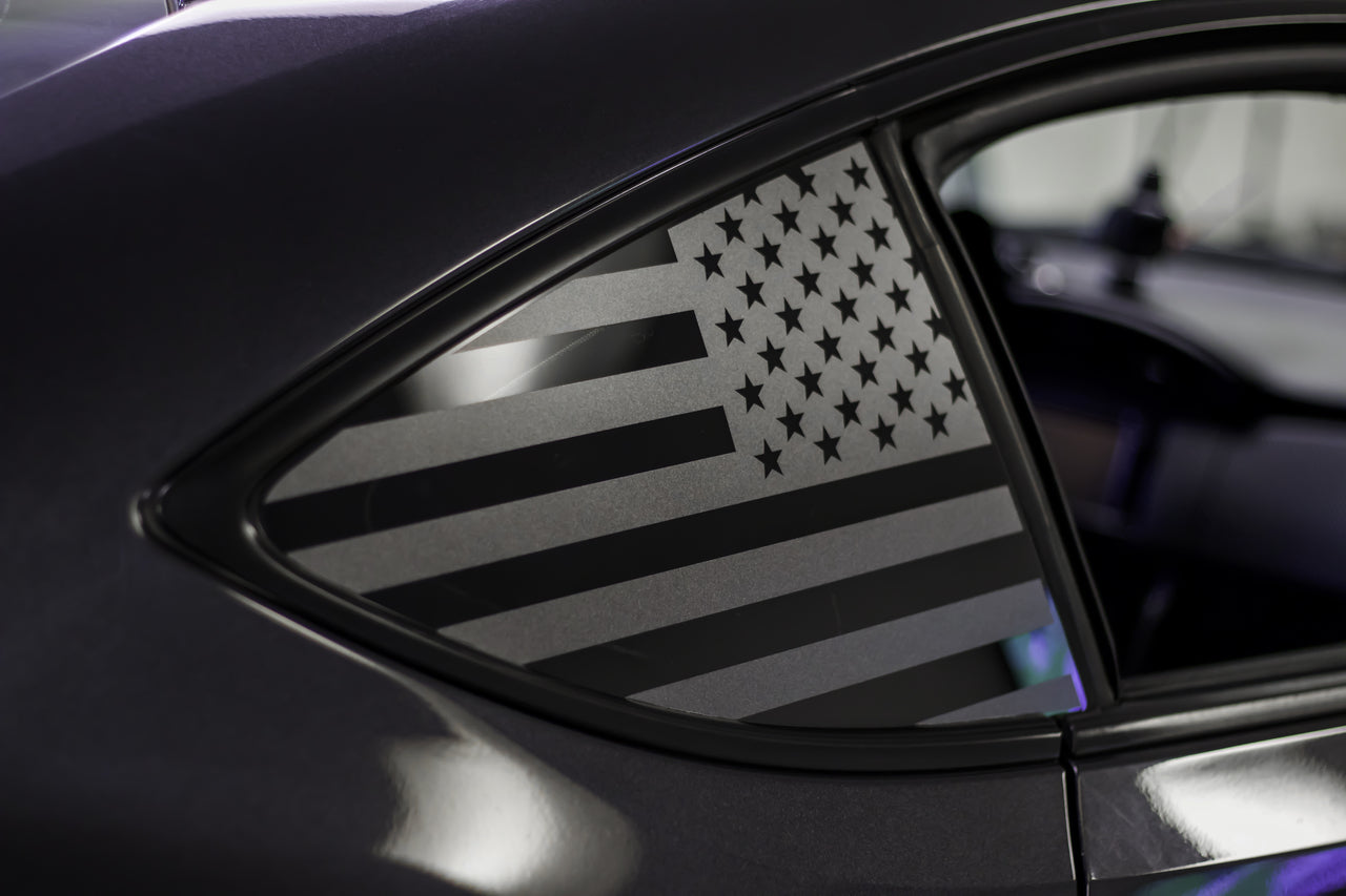 This American Flag Quarter Window Decal set takes your BRZ, FRS, or 86 un-used quarter window and turns it into a great focal point with this patriotically stylish flag decal. It comes in a satin black OR satin grey finish that adds just the right amount of "cool factor" without being too flashy or in-your-face.
