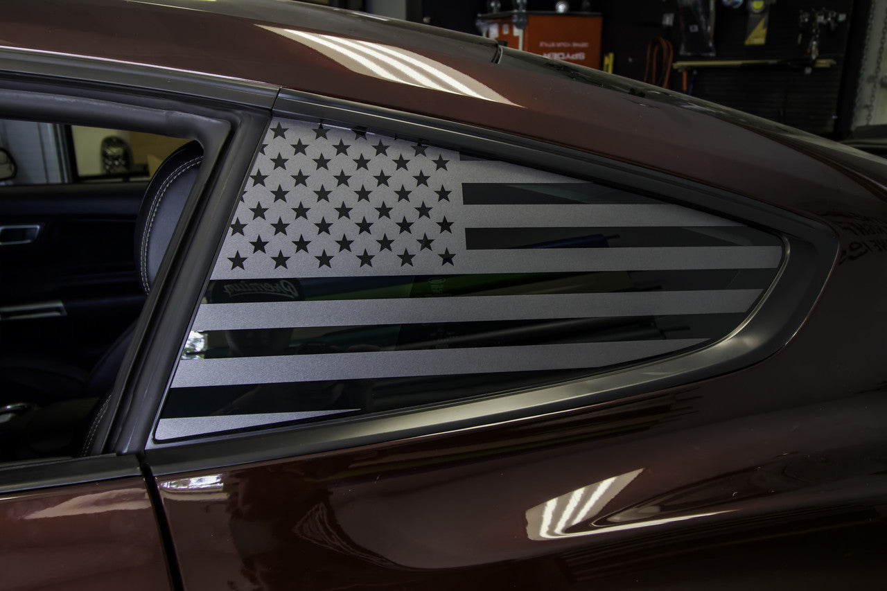 Application. Our American Flag Quarter Window Decals are sold as a PAIR and makes for a perfect fit on any 2015-2023 Mustang
