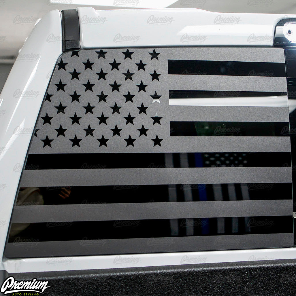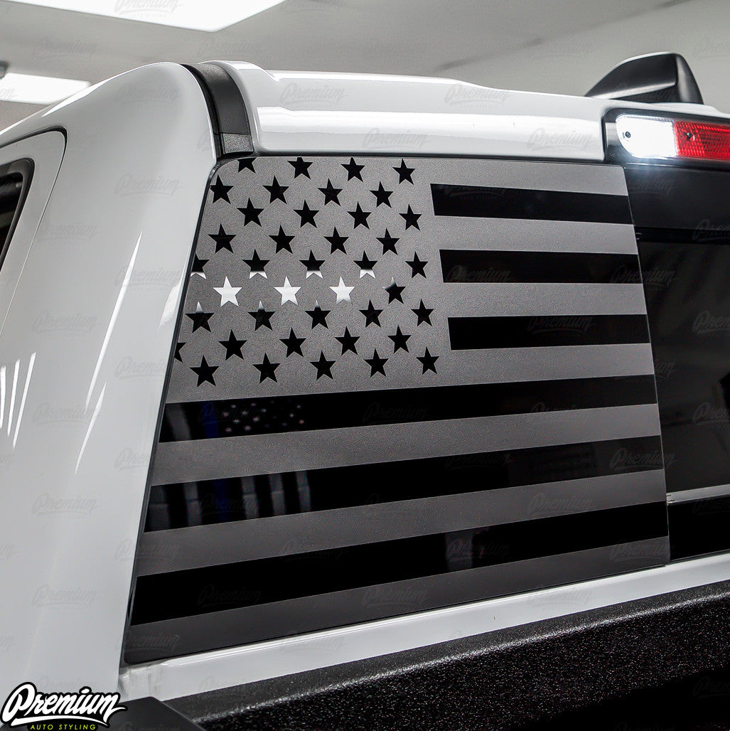 Our American Flag Window Decal is applied to your rear window (behind the driver) and turns it into a great focal point with this patriotic stylish flag decal. It comes in a satin black OR satin grey finish that adds just the right amount of "cool factor" without being too flashy or in-your-face.