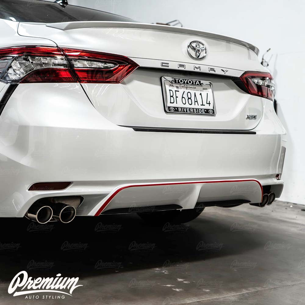 Premium Auto Styling brings you yet another inexpensive way to customize your 2018-2024 Toyota Camry SE / XSE. Premium Auto Styling vinyl overlays are computer precision cut into durable automotive grade tint film. This product covers and stylizes the your rear bumper diffuser. Unlike most ebay or amazon vendors, Premium Auto Styling vinyl overlays are designed and produced here in the USA in our own facility. We design and test fit all products to ensure a perfect fitment guaranteeing you the best results . Basically, if they don’t work on our cars, they’re not going to end up on yours. If you are looking for an inexpensive styling modification, or you just want to change up the factory look, this is one of many overlays for your Toyota Camry!
