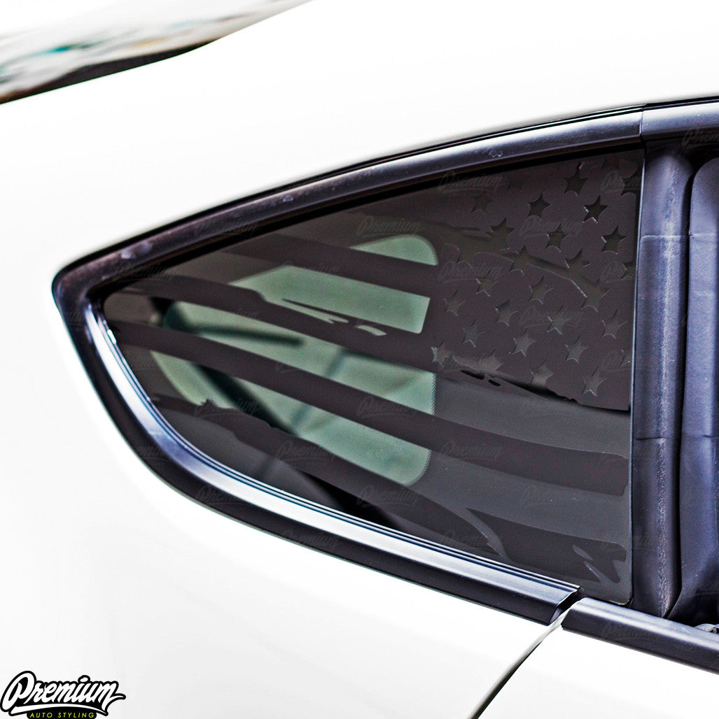 Our American Flag Window Decal is applied to your quarter windows and turns it into a great focal point with this patriotic stylish flag decal. It comes in a satin black OR satin grey finish that adds just the right amount of "cool factor" without being too flashy or in-your-face.