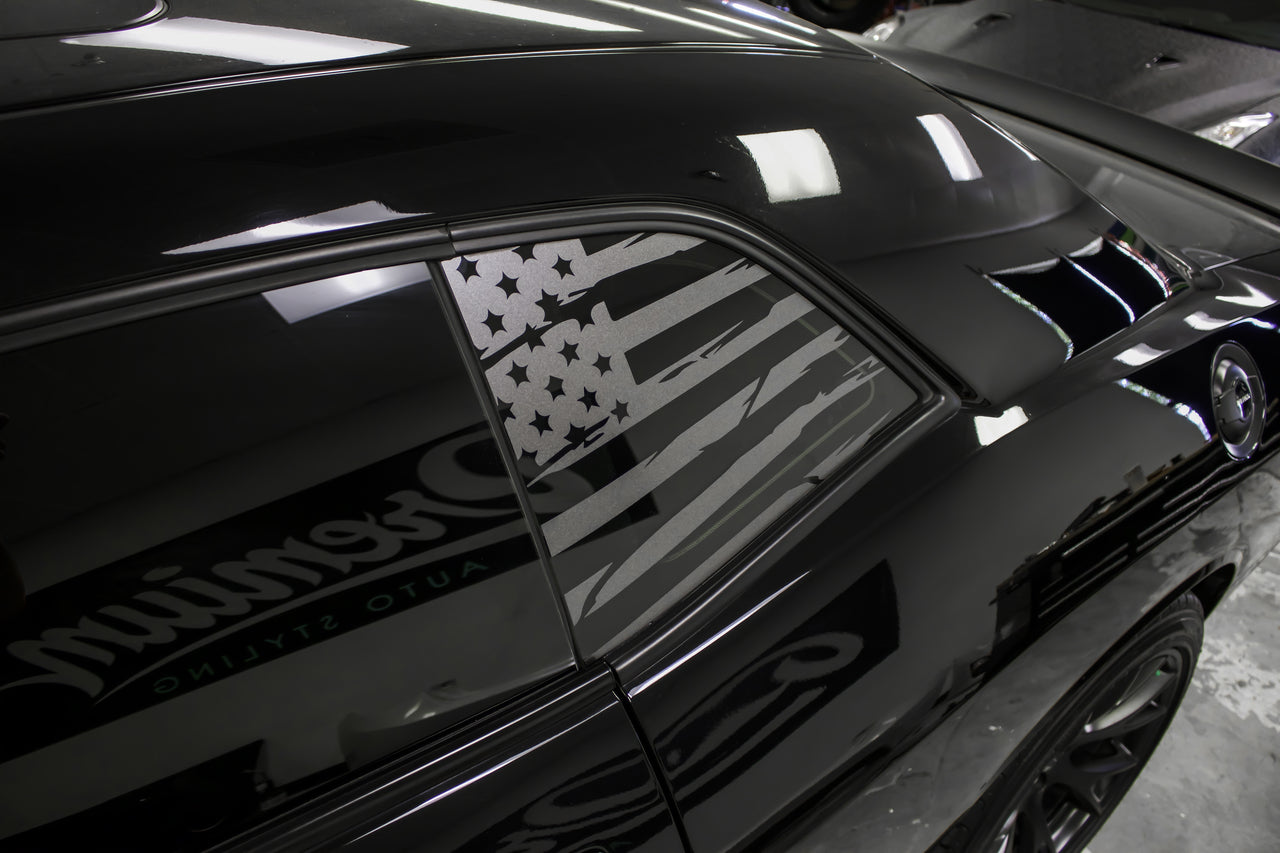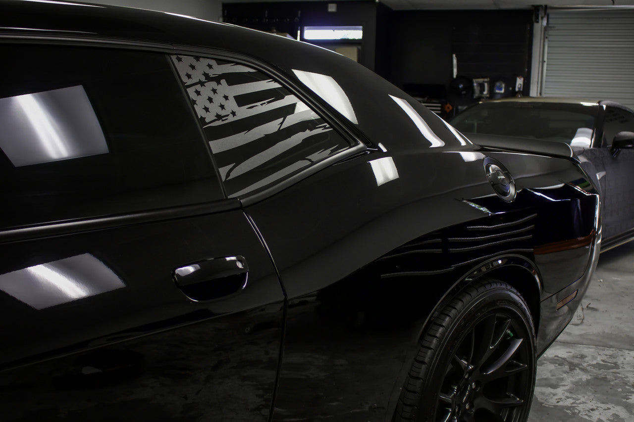 This Distressed Flag Quarter Window Decal set takes your 2008-2023 Dodge Challenger un-used quarter window and turns it into a great focal point with this patriotically stylish flag decal. It comes in a satin black OR satin grey finish that adds just the right amount of "cool factor" without being too flashy or in-your-face.