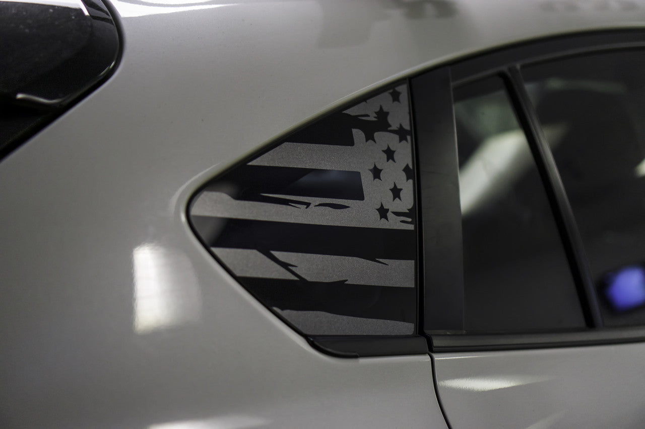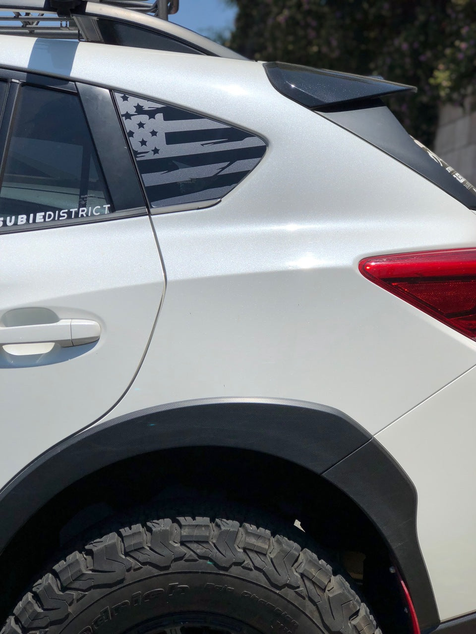 This American Flag Quarter Window Decal set takes your 2018+ Subaru Crosstrek un-used quarter window and turns it into a great focal point with this patriotically stylish flag decal. It comes in a satin black OR satin grey finish that adds just the right amount of "cool factor" without being too flashy or in-your-face.