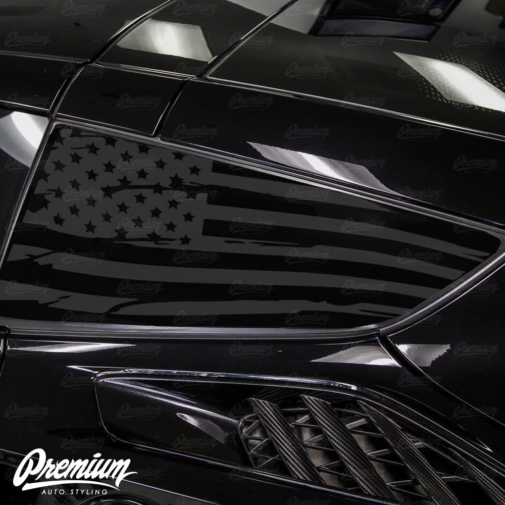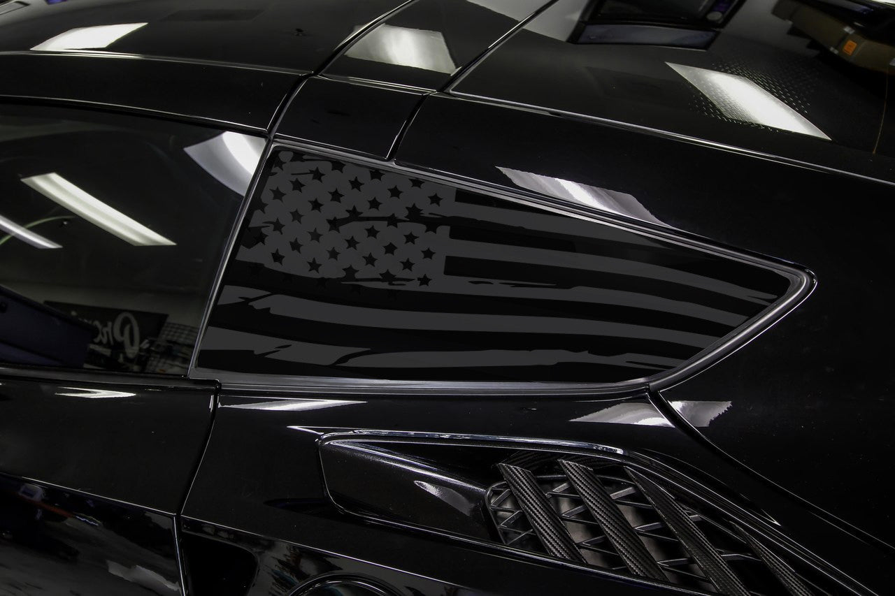 Our American Flag Quarter Window Decal set takes your Corvettes un-used side window and turns it into a great focal point with this patriotic stylish flag decal. It comes in a satin black OR satin grey finish that adds just the right amount of "cool factor" without being too flashy or in-your-face.