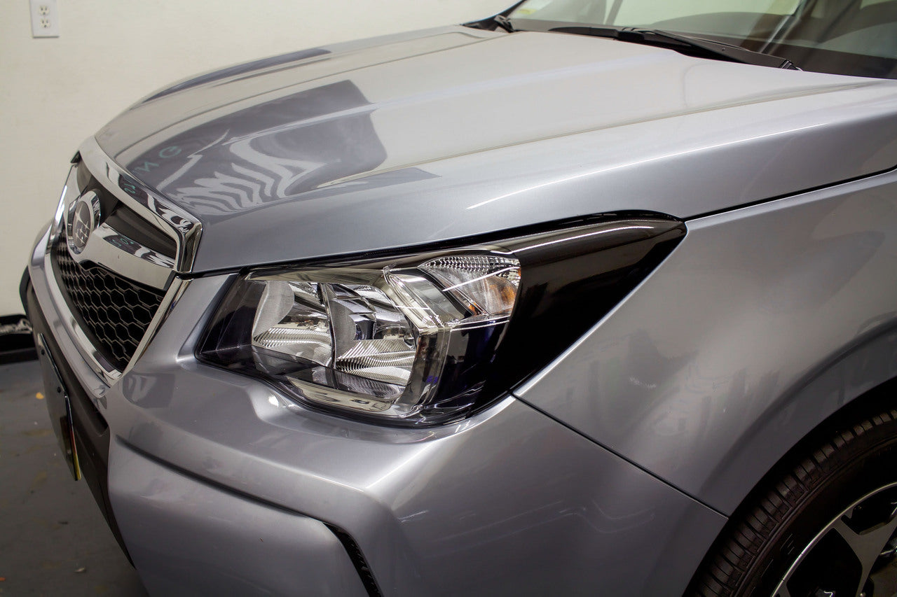 2014-2016 FORSTER HEADLIGHT AMBER DELETE OVERLAY - Premium Auto Styling Black Out Automotive Vinyl Wrap Pre-Cut for your headlight reflectors add great styling for a low price! The overlays are precision cut from a durable vinyl for a perfect fit and aggressive styling that’s sure to look good on any color Forester! Made from quality smoked tint vinyl. application takes roughly 20 minutes to complete the entire project.
