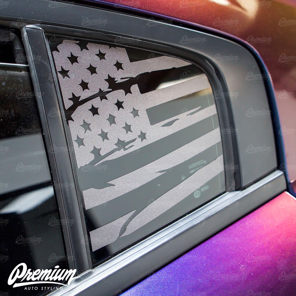 Our American Flag Quarter Window Decal set takes your Dodge Charger's un-used side window and turns it into a great focal point with this patriotic stylish flag decal. It comes in a satin black OR satin grey finish that adds just the right amount of "cool factor" without being too flashy or in-your-face.