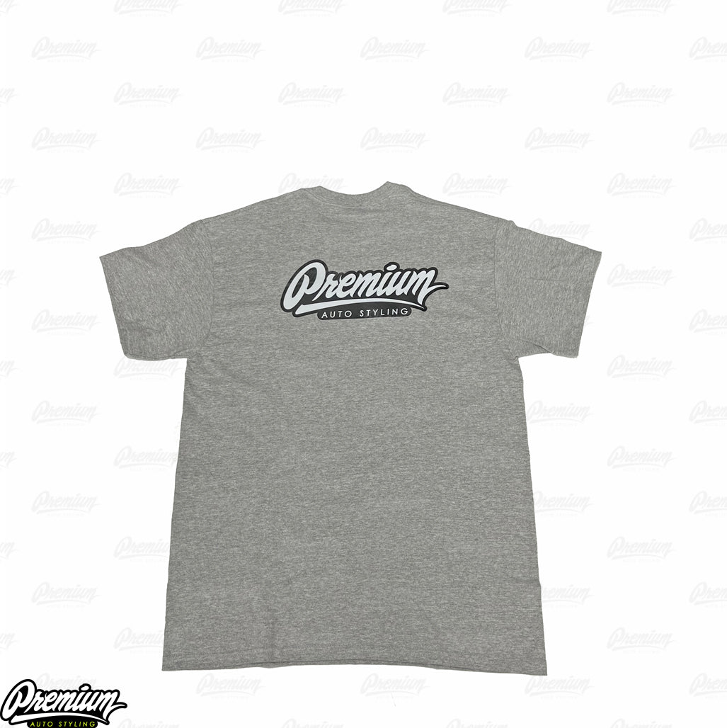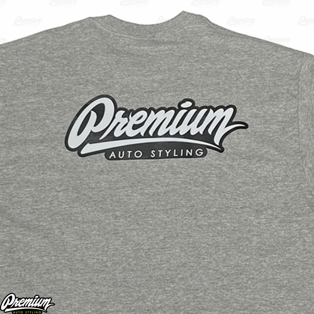 Represent the roots of Premium Auto Styling with the timeless SHOP TEE in Gray – where style meets passion for the automotive lifestyle.