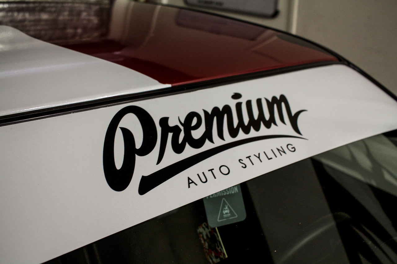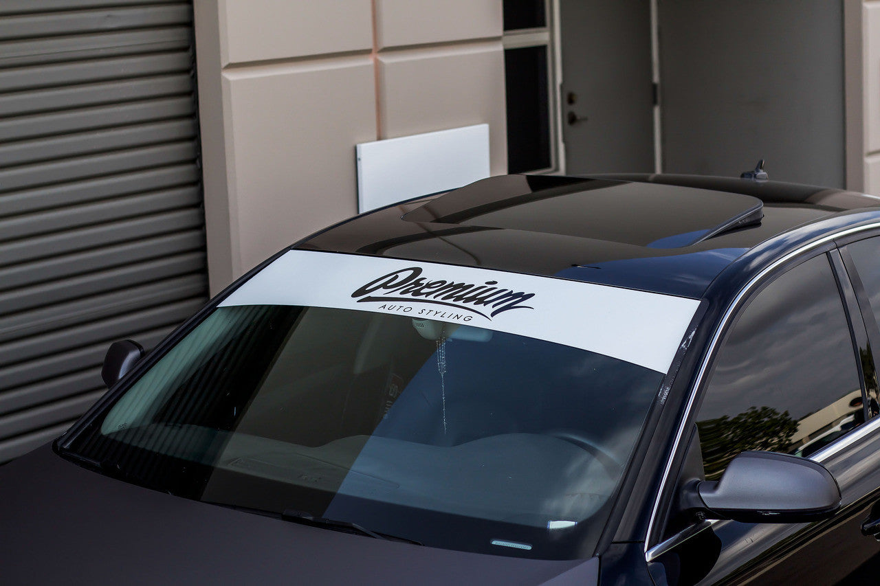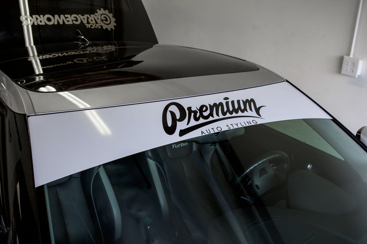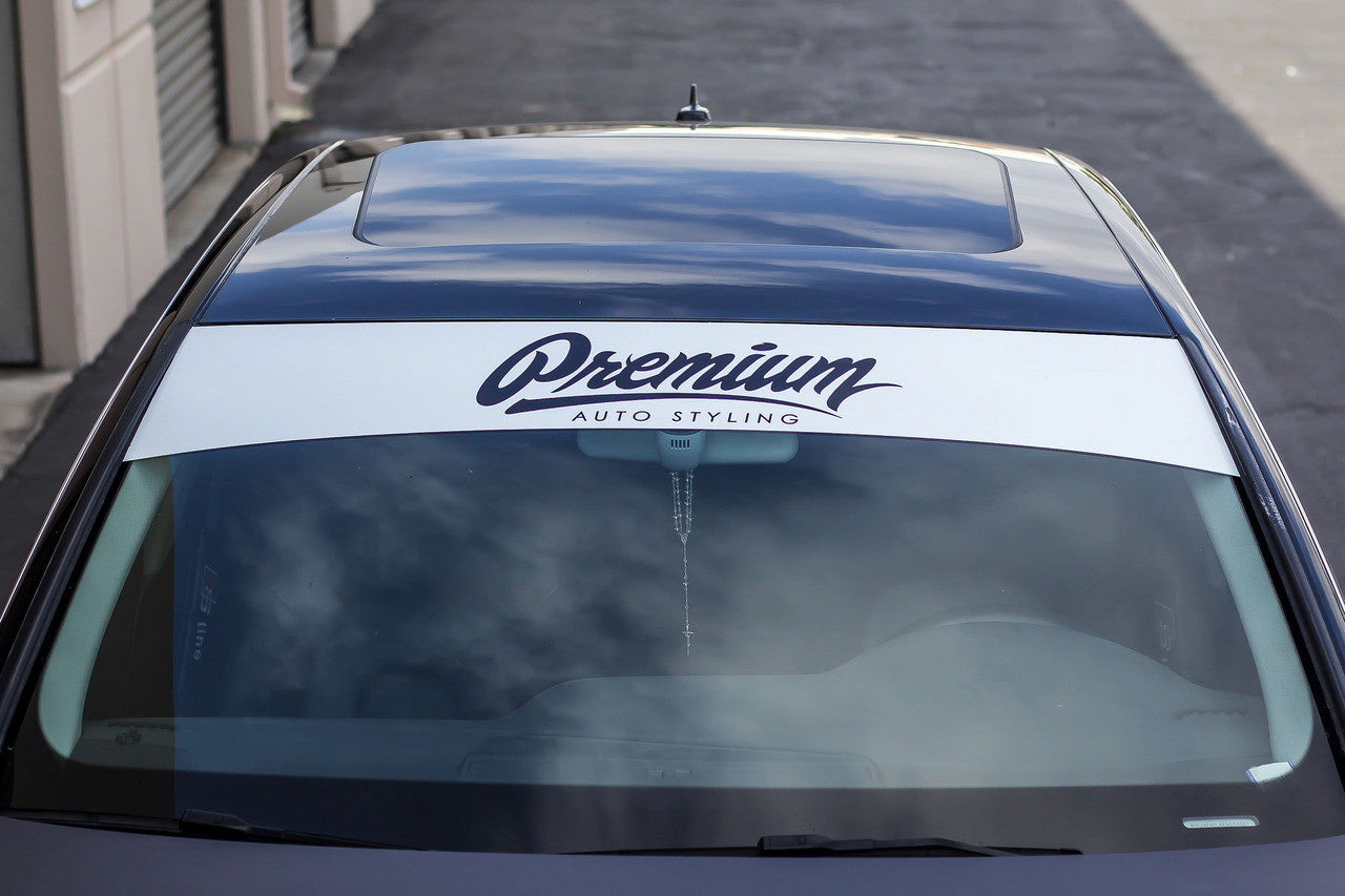 Universal window banner. White base with black Premium Auto Styling logo. Easy to install air release vinyl. (wet application recomended for first time or DIY). Simply lay and trim banner to fit your windshield.