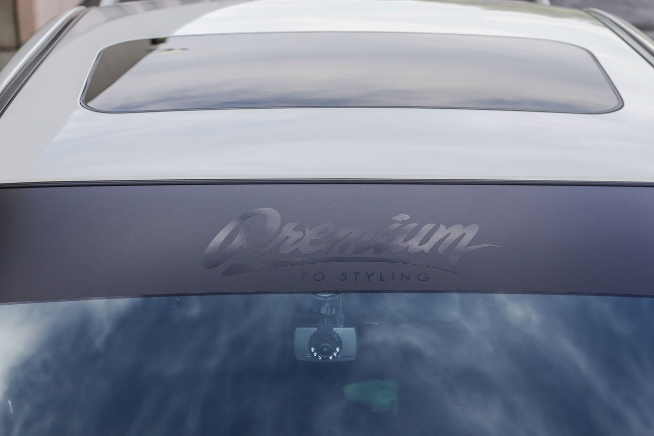 Universal window banner. Satin black base with gloss black Premium Auto Styling logo. Easy to install air release vinyl. Simply lay and trim banner to fit your windshield.