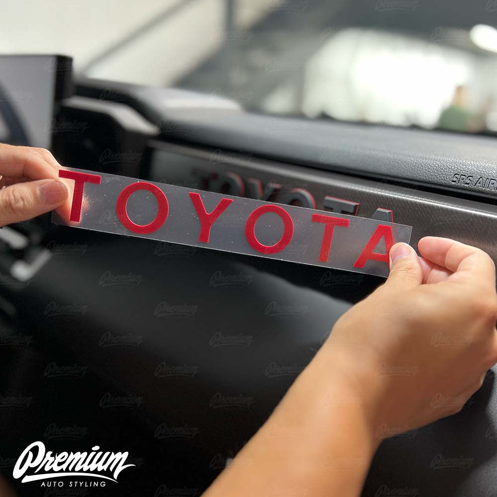 One full set of pre-cut vinyl overlays — designed to apply directly on top of the OEM “TOYOTA” dash lettering.